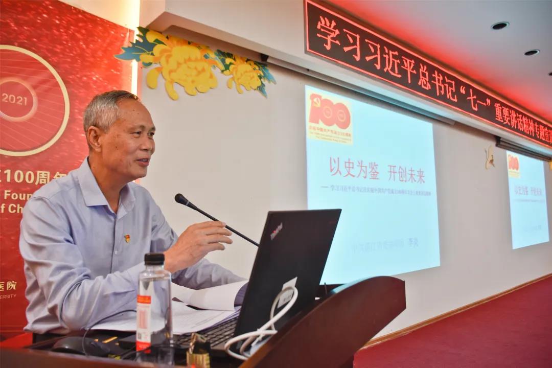 为持续深入学习贯彻习近平总书记”七一”的重要讲话精神,推动党史学习教育深入开展,10月19日,广东医科大学附属医院举办学习贯彻习近平总书记“七一”重要讲话精神专题宣讲,邀请湛江市委讲师团团长李炎教授作宣讲报告。医院党委领导班子、中层干部、护士长、党支部书记参加宣讲会,医院党委书记李明意主持会议。