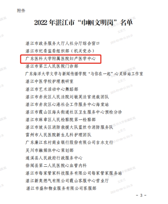 为纪念“三八”国际妇女113周年,树立榜样引导和激励广大妇女以更加饱满的热情、更加昂扬的斗志状态奋进新征程、建功新时代,3月8日,湛江市妇女联合会举行了湛江市三八红旗(集体)表彰活动,我院妇产医学中心荣获2022年湛江市“巾帼文明岗”荣誉称号。