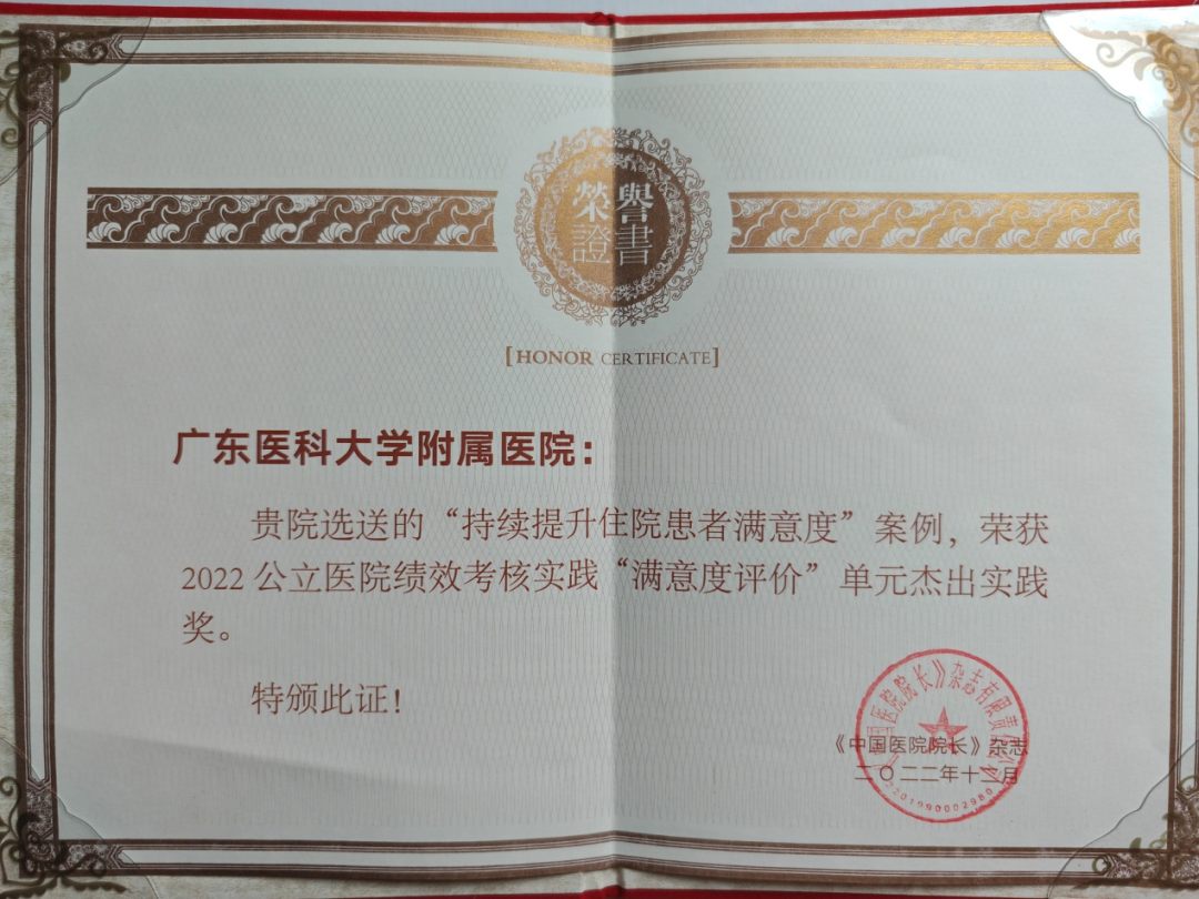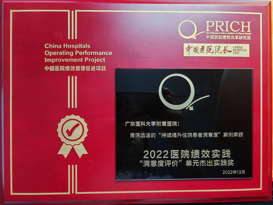 与此同时,在第三届公立医院绩效大会上,我院质量管理部选送的“持续提升住院患者满意度”案例荣获2022医院绩效实践“满意度评价”单元杰出实践奖。
