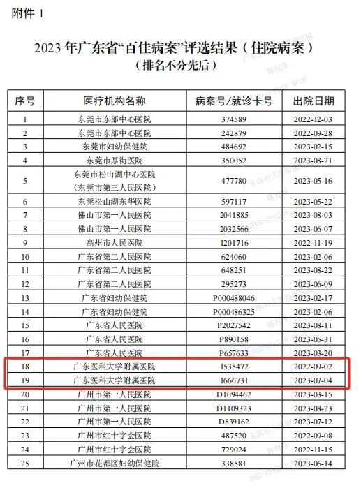 近日,广东省卫生健康委办公室发布《关于2023年广东省“百佳病案”评选结果的通报》。广东医科大学附属医院5份病案(感染内科与热带医学科1份住院病案、神经变性疾病专科住院病案1份、眼科日间医疗病案2份、肺部肿瘤专科门诊门(急)诊病案1份)获得省“百佳病案”称号,是湛江市入选“百佳病案”最多的医疗机构。全省共300份病案获奖。