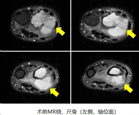 结合影像学检查结果以及病理穿刺结果,可以明确诊断为左侧桡骨骨巨细胞瘤 III级,首选手术切除病灶;且具有侵袭性的III级,则需要彻底完整切除肿瘤以及行桡骨重建手术。