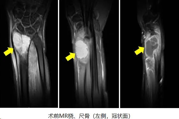 3D打印假体费用相对较高,对于一个普通的工薪阶层家庭来说,家庭经济承受能力是个问题;考虑到小英还很年轻,郑鸿主任医师团队决定从患者实际需求出发,制定了个体化手术方案,选择骨科难度较高的术式之一—左侧桡骨远端瘤段广泛切除+对侧自体腓骨移植重建术。
