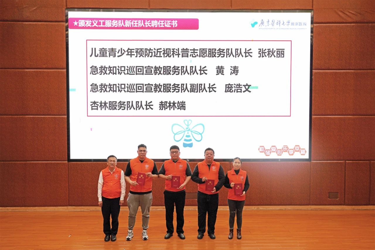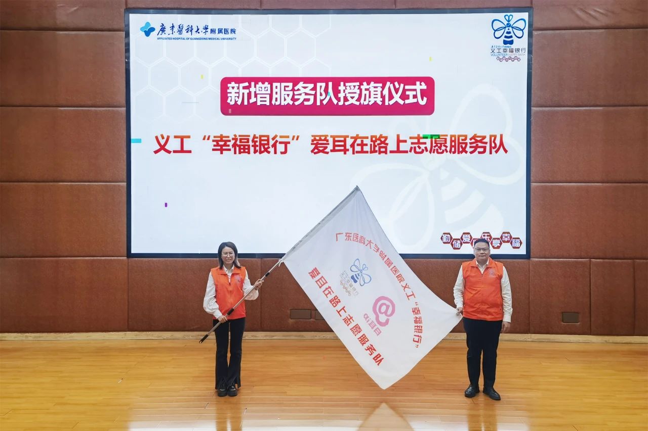 与会领导、嘉宾为新增的义工“幸福银行”医学传播学社服务队、义工“幸福银行”爱耳在路上志愿服务队授队旗,为义工“幸福银行”东莞第一医院分行授牌。