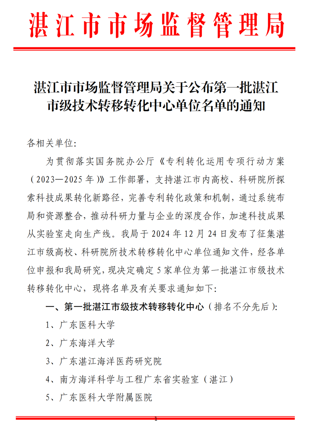 12月26日,湛江市市场监督管理局公布第一批湛江市级技术转移转化中心单位名单,广东医附院成功入选5家中心单位之一,为全市医疗机构首家。