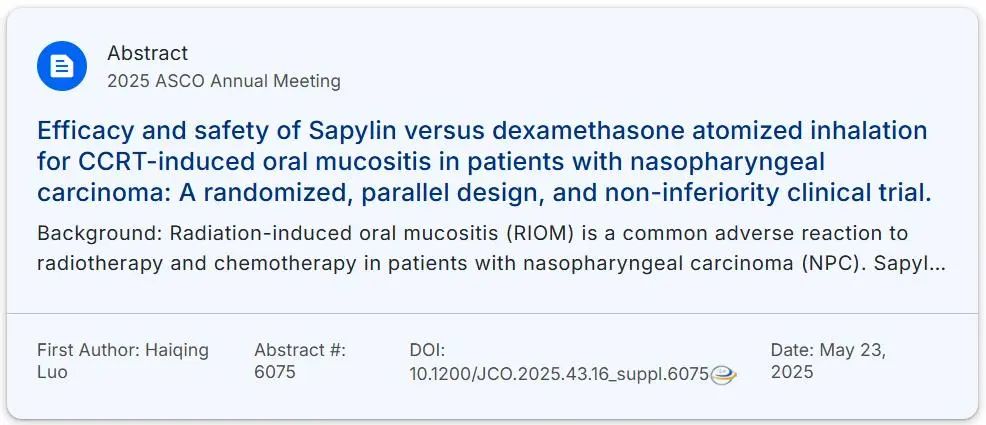 《沙培林对比地塞米松雾化吸入治疗鼻咽癌患者放射性口腔黏膜炎的疗效和安全性:一项随机、平行设计、非劣效性临床试验》(Poster 6075)英文题目:Efficacy and safety of Sapylin versus dexamethasone atomized inhalation for CCRT-induced oral mucositis in patients with nasopharyngeal carcinoma: a randomized, parallel design, and non-inferiority clinical trial.