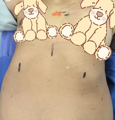 术前准备充分,在麻醉手术中心团队协助下,仅在剑突下、双侧锁骨中线肋弓下缘各做一长约0.8cm小切口,分别置入达芬奇机器人胸腔镜和两个机械臂,手术进行非常成功。在帮助患者切除病灶同时,也让患者快速康复,感受到胸部微创手术及科技的快速发展。