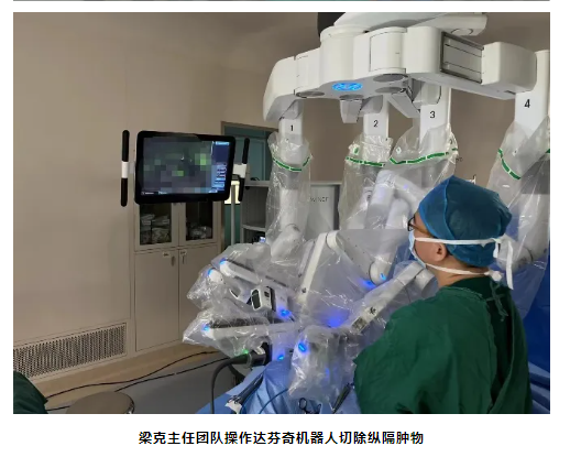 近日,广东医科大学附属医院胸外科梁克主任医师成功开展本院首例达芬奇机器人辅助剑突下入路胸腔镜纵膈肿物切除术。术后患者疼痛轻,恢复快,已康复出院。