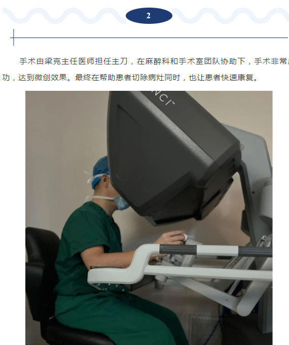 这是我院首例达芬奇机器人辅助经剑突下入路切除纵隔肿物的手术,体现了胸外科人员不断探索创新,引进先进技术,为患者提供更加安全、高效、精准的医疗服务,以实际行动践行“以患者为中心”的医疗理念。
