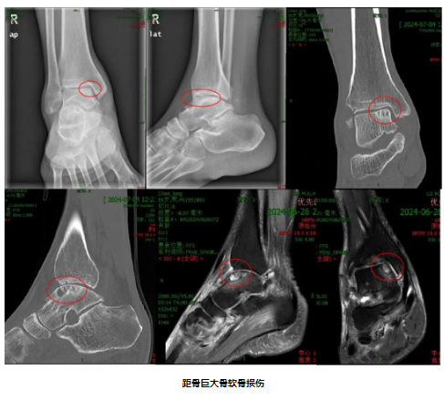 55岁的陈先生近4年来反复出现右侧踝关节肿痛,逐渐影响日常生活。其就诊过多家医院,先后尝试过多种治疗方式,总体效果并不满意,而患肢的疼痛症状和活动功能障碍也越来越糟糕。后来陈先生了解到广东医科大学附属医院运动医学科钟环副主任(主持工作)团队在足踝疾病诊疗方面具有丰富的经验,遂到附属医院就诊。经过运动医学团队钟环主任医师和黄华军博士后的询问病史和详细查体后,诊断为右侧距骨骨软骨损伤(Hepple Ⅴ期),目前的距骨已出现了不可逆的骨软骨损伤,必须对关节软骨面进行手术修复重建。入院后的踝关节CT以及MRI显示距骨骨软骨损伤病灶面积较大且位置深,分布于距骨内侧穹隆中后方,且出现直径、深度均大于1cm骨囊性变。专科团队经过反复术前病情讨论后一致认为,患者正值壮年,过早的关节融合手术将给生活质量带来较大的影响,而全踝关节置换手术则要考虑假体生存率带来的二次翻修手术问题。综合考虑患者自身年龄、身体机能以及意愿因素,团队决定采用经内踝截骨入路的自体髂骨骨膜骨移植修复距骨骨软骨损伤+距腓前韧带修补的二联手术方案。