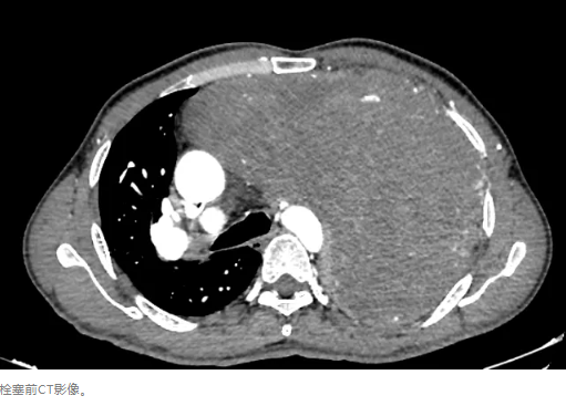 治疗前背景:患者黄某某,男性,56岁,2019年时因活动后气促行CT检查发现左侧胸腔内有一肿物影,大小约5cm*5cm*3cm,考虑良性肿瘤。当时未予重视,未行进一步检查及治疗。近年来,患者活动后气促逐渐加重,直到2024年5月再次就诊,行CT检查提示左侧胸腔肿物明显增大,约30cm*25cm*25cm,巨大的肿瘤几乎占据了整个左侧胸腔,并严重挤压纵隔、气管、心脏,导致以上重要器官出现明显移位。