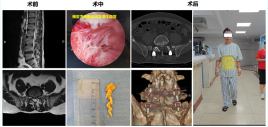 技术特点:该患者术中神经完全被瘢痕组织包绕,神经根严重粘连,传统开放手术视野受限,极易造成硬膜囊撕裂,神经损伤,但在UBE下水介质可清晰放大视野,从而安全、微创完成手术。术后患者左下肢疼痛明显缓解,术后第二天即可佩戴支具起床活动,术后三天出院。左下肢VAS评分1分。