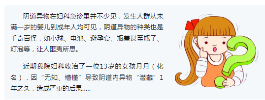 患者月月,13岁,初中生,否认性生话史。自诉一年前因外阴瘙痒自行购买药物使用,用药时不慎将瓶塞误塞入阴道,因怕被父母责骂不敢告知父母。1年来强忍着下腹部疼痛、阴道流液及腰痛等不适。