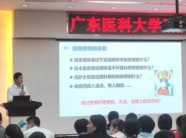 急诊医学中心护士长符景松指出护理创新来源于临床工作中发现的问题,问题即可进行创新,通过举例介绍了如何开展创新工作,并现场分享自己的专利“一种新型膜式氧合器固定装置”申请的全过程。符护士长的讲授使大家打开了创新思路,明白了人人都可以创新。