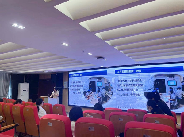 汇报会上,16位护士长通过制作精美PPT的形式,根据本专科的医疗特色,结合专科护理服务能力,从项目背景、方案、实施、效果评价、存在问题及下一步计划等方面进行汇报,汇报内容精彩,具有专科特色。其中技术类的如新生儿专科的“早产儿院内有温度地转运”、老年医学科二区的“五行音乐疗法结合开天门及耳穴压豆在BPSD患者中的应用”、中医科的“隔物灸在阳虚症患者的应用”、康复医学科的“神经源性直肠的规范化管理”等11项;服务类的如生殖中心的“多囊卵巢综合征医学体重管理对妊娠结局影响”及门诊部的“健康宣教小巡讲”等6项。