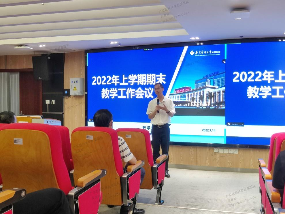 会上,第一临床医学院副院长、教学部部长佟琳就2022年上学期教学工作进行汇报。首先汇报了2022年上学期教学工作的主要成效,2022年上学期我院共开设47门课程,参与授课教师人数共602人,其中《外科学》、《临床技能学》两门课程共83名教师进行教学改革;另外,《内科学》等6门课程获批为省级一流课程,《疼痛诊疗学》等6门课程获批为校级一流课程,《儿科学》等5门课程获批为粤港澳大湾区在线开放课程,2个团队在省教学创新大赛中获奖,3名教师在校级青教赛获奖,7项课题立项为省级教学课题。其次,介绍了即将进行的教研室调研工作、2022版人才培养方案课程教学大纲修订工作、教学机构业绩考核指标体系等工作的安排。然后,公布2022年度课程思政建设专项项目遴选结果、教学课题经费配套的事宜以及整合课程教学改革工作的进展,并解读与职称晋升相关的教学条件和政策。最后,简要介绍下半年教学工作要点。