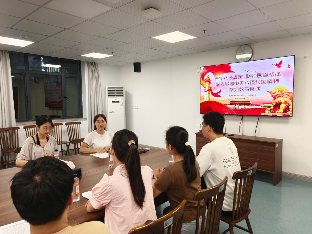 党支部书记姚岚为全体党员讲党课《严守八项规定,践行医者初心》,强调青年党员作为党的新生力量,落实中央八项规定精神是锤炼党性、筑牢信仰根基的关键实践。通过先进事迹与典型违纪案例的正反对比,要求各青年党员务必认真学习贯彻中央八项规定精神,以八项规定精神为引领,“扣好人生第一粒扣子”,严密筑牢清廉行医底线,不断增强廉洁思想与慎独意识,提高医术本领与创新能力,续写作风建设的时代篇章。