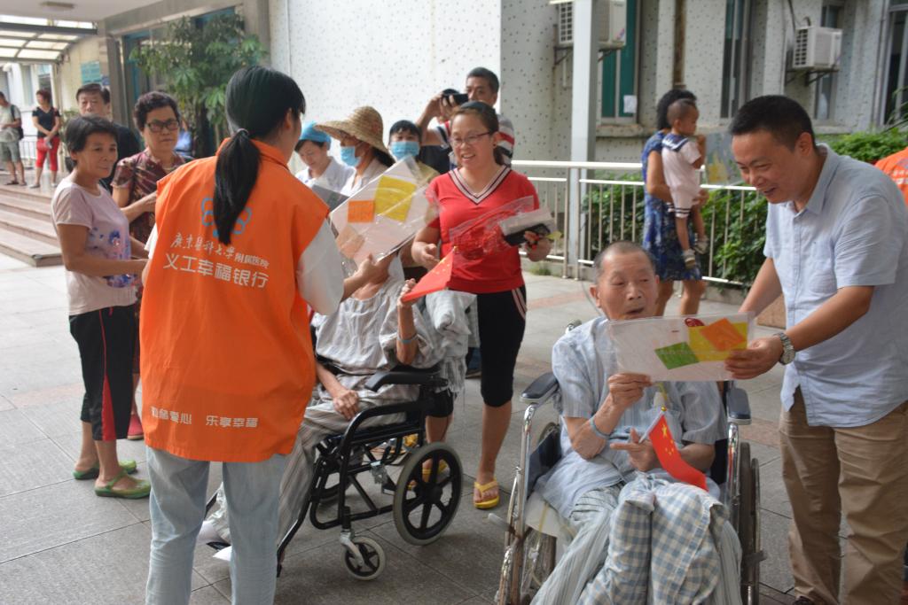 当天上午,门诊大厅内,工作人员向患者及家属发放小国旗和祝福贺卡,表达了对中华人民共和国成立70周年的美好祝福。同时,还与患者和家属一起DIY制作以“国庆”和“重阳”为主题的手工挂件。一首《我和我的祖国》的快闪将活动推向高潮,现场观众手拿国旗一同高歌,整个门诊大厅沉浸在红旗飘飘的海洋里。