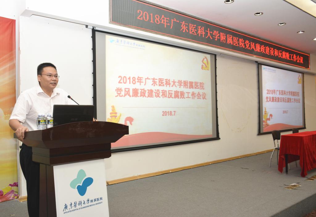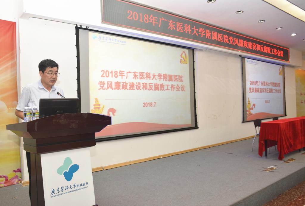 学校党委副书记、纪委书记符学三在会上了重要讲话,指出会议召开得很及时,也很有必要,并代表学校党委、纪委,对医院工作提出三点要求:进一步增强党风廉政建设和反腐败斗争的政治自觉,附院党委进一步强化党风廉政建设和反腐败工作的主体责任,附院纪委进一步强化党风廉政建设和反腐败工作的监督责任。他指出,当前反腐败斗争压倒性态势已经形成并巩固发展,反腐败斗争形势依然严峻复杂,医疗卫生行业依然是腐败问题的易发多发领域。他希望同志们能够积极投入到党风廉政建设和反腐败工作,遵纪守法,群策群力,在附院获批省内首批9家“登峰计划”重点建设医院的新的历史机遇期,力促医院各项工作更上新台阶,为学校建设高水平医科大学和建设健康湛江、健康广东作出新的更大贡献。符书记还强调,附院要进一步加强师德建设,医务人员要强化思想政治学习,同时也应注重身体锻炼。