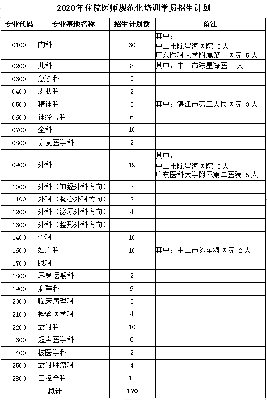 三、2020年住院医师规范化培训学员招生计划