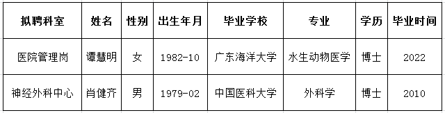根据我院业务发展需要,按照公开、公平、公正的原则,对符合引进条件的人员进行了相关考核。经医院院长办公会、党委会讨论,拟对引进的博士予以公示。公示期:2022年7月29日至2022年8月4日止,公示7天。如有异议,请在公示期间向医院纪检监察室或高层次人才办公室书面反应情况。