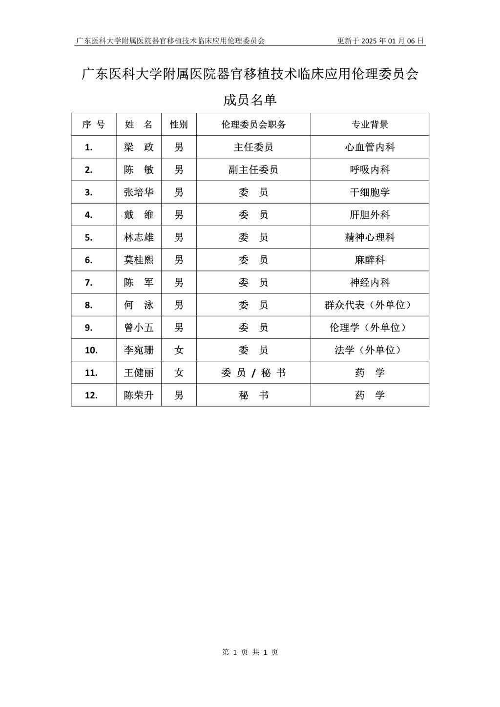 人体器官移植技术临床应用伦理委员会名单(文件编号:广东医附政发[2025]1号,日期:2025-01-06)