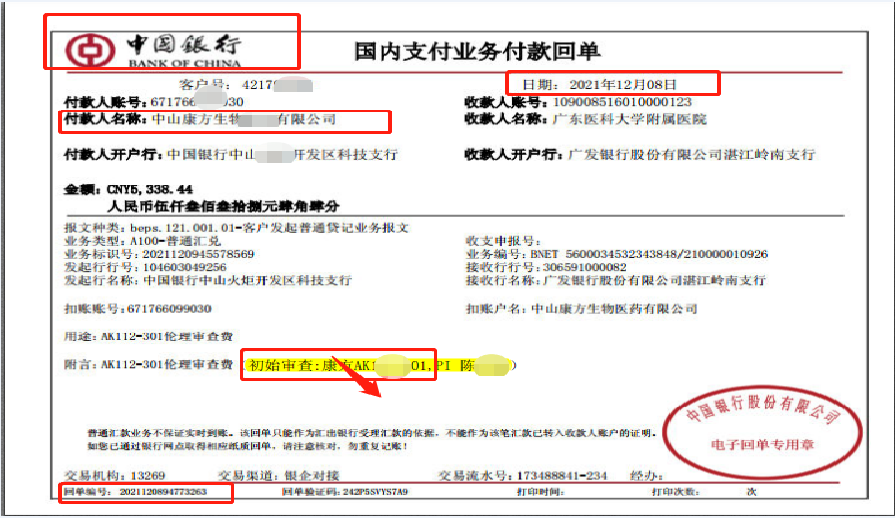 一、 费用凭证——备注项目受理号或项目名称、PI姓名。编辑付款方、回单编号、汇款日期、汇款银行信息于递交纸质版材料时同步受理登记。