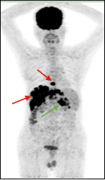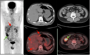 男,56岁,CEA: 40.5ng/ml,图A:肝脏多发转移瘤(红色箭头),图B:显示结肠肝曲高代谢肿块(绿色箭头),经肠镜证实为结肠腺癌。