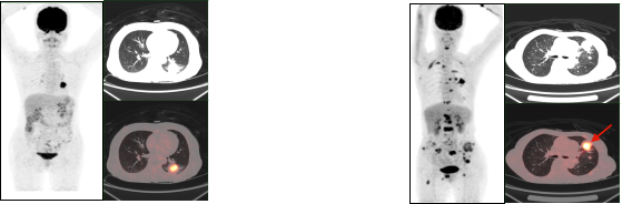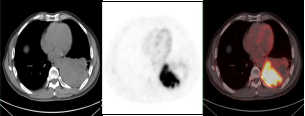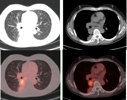 肺癌放疗前确定生物靶区:左肺下叶鳞癌患者(右图所示),左下肺癌病灶并远端阻塞性肺不张,PET/CT可以准确区分肿瘤组织与非肿瘤组织,确定肿瘤病灶生物靶区。
