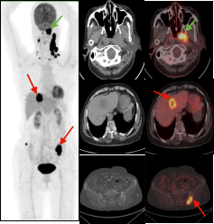 鼻咽癌全身转移:PET/CT显像示鼻咽左侧高代谢软组织肿块(绿色箭头);病理证实鼻咽非角化上皮癌,双侧颈部、肝脏及双侧髂骨多发转移瘤(红色箭头)。