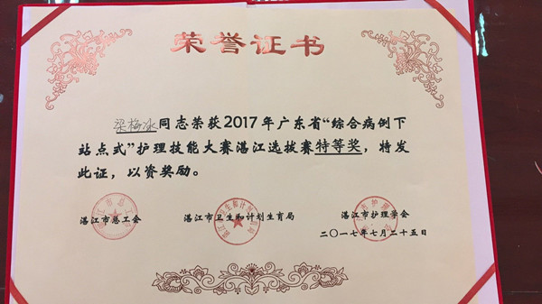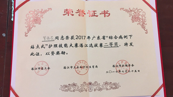 为加强护士队伍建设,提高护理服务质量,2017年7月24-25日,广东省“综合病例下站点式”护理技能大赛湛江选拔赛”在湛江市中医学校隆重举办,本次比赛由湛江市卫计局、湛江市总工会、湛江市护理学会联合主办,湛江市中医学校协办,共有来自全市22家医院43名护理骨干参赛,我院有三名选手参加了本次比赛。