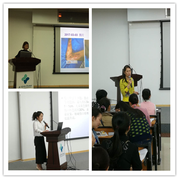 课堂上,专科联络员潘晶晶、周雅双和伤口造口专科小组梁小玲护士长分别进行了临床典型案例分享,介绍了伤口护理的全过程,同时强调了全身评估的重要性。