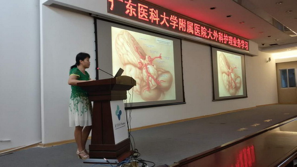 在这次授课中,首先由李爱文老师主讲《颅内动脉瘤和动静脉畸形的护理》,她从解剖层次上详细分析发病原因,运用临床实例阐述常见临床症状及介入栓塞手术前后病人的病情观察等,内容实用,深入浅出,条理清晰。