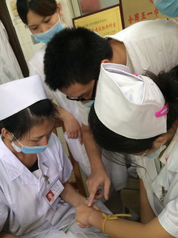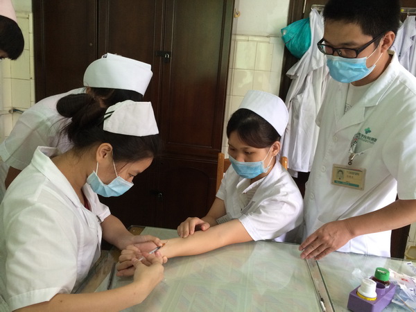 随着现代医疗护理的发展及实习护生对带教要求增高,急诊科护理组把护生实习与带教工作纳入系统化、规范化管理,确保护生在实习期间的学习质量,本年度护生在6月30号正式下临床实习,实习的第一天,急诊科护理组安排实习同学的第一堂课是:身同感受—痛病人之所痛。同学之间互相皮试、互相静脉穿刺,招婷护长与周健东带教组长把同学集中培训:测体温、脉搏、血压,手把手教同学做皮试,看皮丘,选血管……急诊护理组将不断摸索带教经验,持续改进教学方法。(文 梁伟/图 招婷)