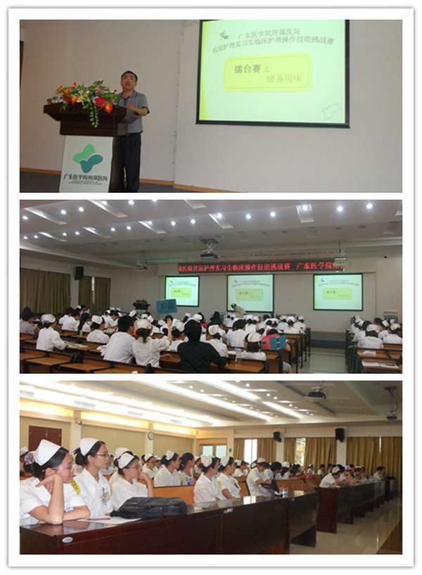 2012年10月19日,由护理本科及大专实习生组成的14支参赛队伍在广东医学院附属医院学术报告厅参加了“首届护理实习生临床操作技能挑战赛”的第一场比赛。各参赛队伍安排1~2人参赛,共有15人参加了比赛。比赛评委由5名临床带教老师/护长及4名学生组成。比赛在教学部周仲佑副部长致开幕辞后正式开始。参赛选手头戴燕帽,身穿护士服,紧张有序进行着“铺备用床”的操作,现场同学认真观摩,并不断地为本组选手加油,评委团更是不放过一边一角,在选手操作完后立即上前检查。最后沈遂英、许小泳、吴夏柳同学的表现获得评委团的肯定,分别为她所在参赛队伍获得10、8、5个累积分。