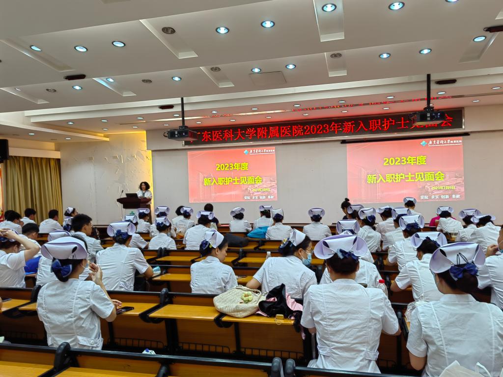新入职护士见面会于2023年7月6日在学术报告厅举行。见面会由护理部副部长姜萍主持,并对新入职护士人力安排进行说明。