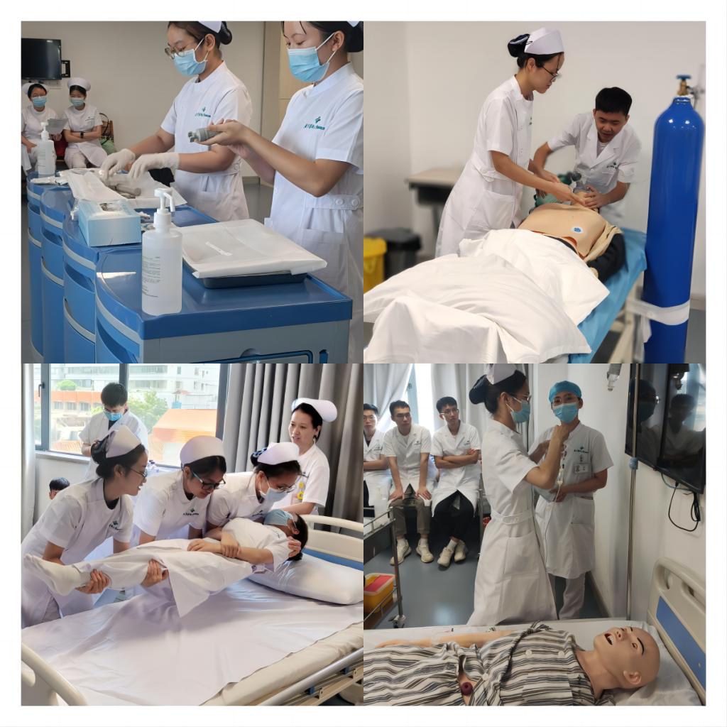 新入职护士护理操作技能培训分四个小组进行,涉及八项内容,包括急危重人抢救(徒手心肺复苏、简易呼吸器的使用、咽通管的使用以及喉镜的安装)、晨晚间护理(协助变换体位/卧位、卧床病人更单、皮肤清洁、协助病人更衣、酌情翻身叩背、有效咳嗽)、口腔护理、生命体征监测、吸痰法(翻身叩背,有效咳嗽)、防跌倒(平车/轮椅的使用)、防压疮与静脉输液/接液体。