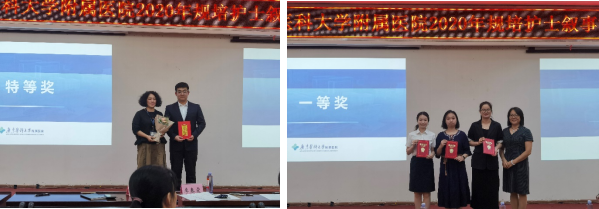 经过激烈地角逐,评委综合选手对叙事护理的理念、叙事技术的运用、语言表达课件制作以及形象风度等进行打分。护理部翟桂政《拯救“小红花”——以叙事为题的一场“救赎”》获得特等奖,胃肠外科庞玉宇《我的榜样》、五官科黄妙霄《会说话的眼睛》、中医科陈焱《休息之所—手机》等三位选手获得一等奖。