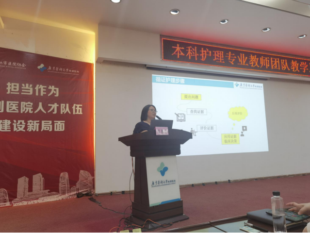 《护理研究》课程负责人李春霞老师以典型护理案例引发全体参训人员思考“护理教学中遇到重点难点问题应如何思考?如何进行循证总结?”,并从循证医学概述、循证护理实施步骤等两个方面进行分享,介绍了护理教学工作中的思维困境,并针对教师循证思维培养问题详细地讲解了循证护理实践中应如何提出问题、查找证据、评价证据、应用证据临床决策及后效评价,奠定了护理教师团队循证思维构建的知识基础。