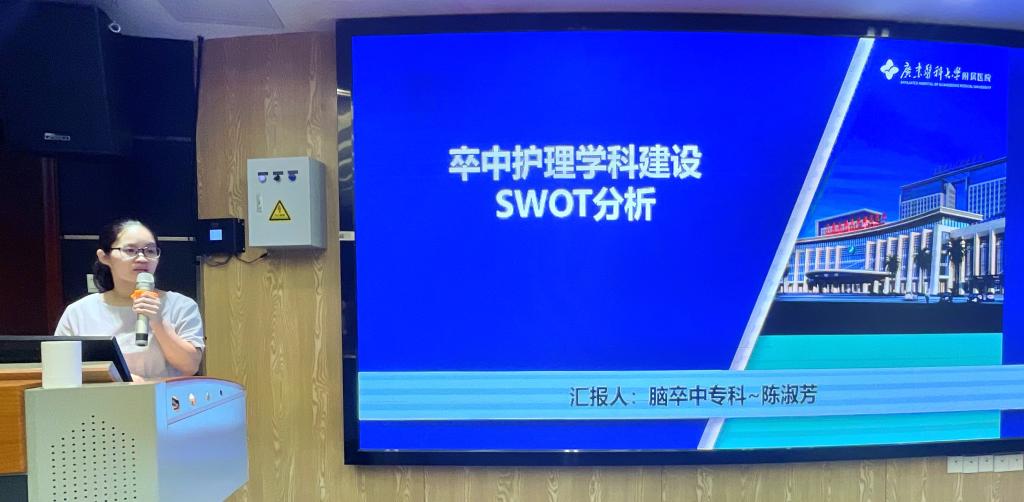 陈淑芳专科护士汇报了我院脑卒中专科护理组在专科护理建设方面的SWOT分析及依据分析结果制定的卒中护理专科的建设思路和举措:推进亚专科护理体系建设,提升危重症、疑难病例护理能力;推进中西医结合护理新技术、新项目,共同提升专科质量;塑造学科健康公益品牌等。