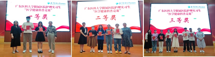 视频科普制作组由谭云彤,莫彤,黎炜诗的《以“艾”之名——感染HIV,我该怎么办?》获得一等奖;陈晓雯、陈达青、谢锦、潘美君《胆囊结石那些事儿》和陈心如、肖林菁、吴志恒《防跌倒,知多少》获得二等奖;邓树君、姜睿瑜、胡沅君《舞动快乐、舞出青春》、黄思仪、杨景庐、连智慧、邱江《小宝宝不会咳痰怎么办?》和龙昊、梁格静、叶高峰、李佳腾《生娃咨询Q&A》获得三等奖。