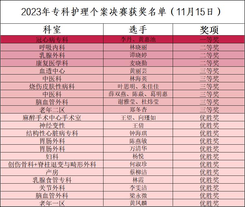经过激烈角逐,冠心病专科李丹荣获一等奖,呼吸内科林晓丽、乳腺外科谭晓婷、康复医学科麦晓勤荣获二等奖,血透中心黄丽芸、中医科林海英、烧伤皮肤性病科叶思明、中医科薛双燕、脑血管外科杜炜莹、老年二区郑冬杏荣获三等奖。