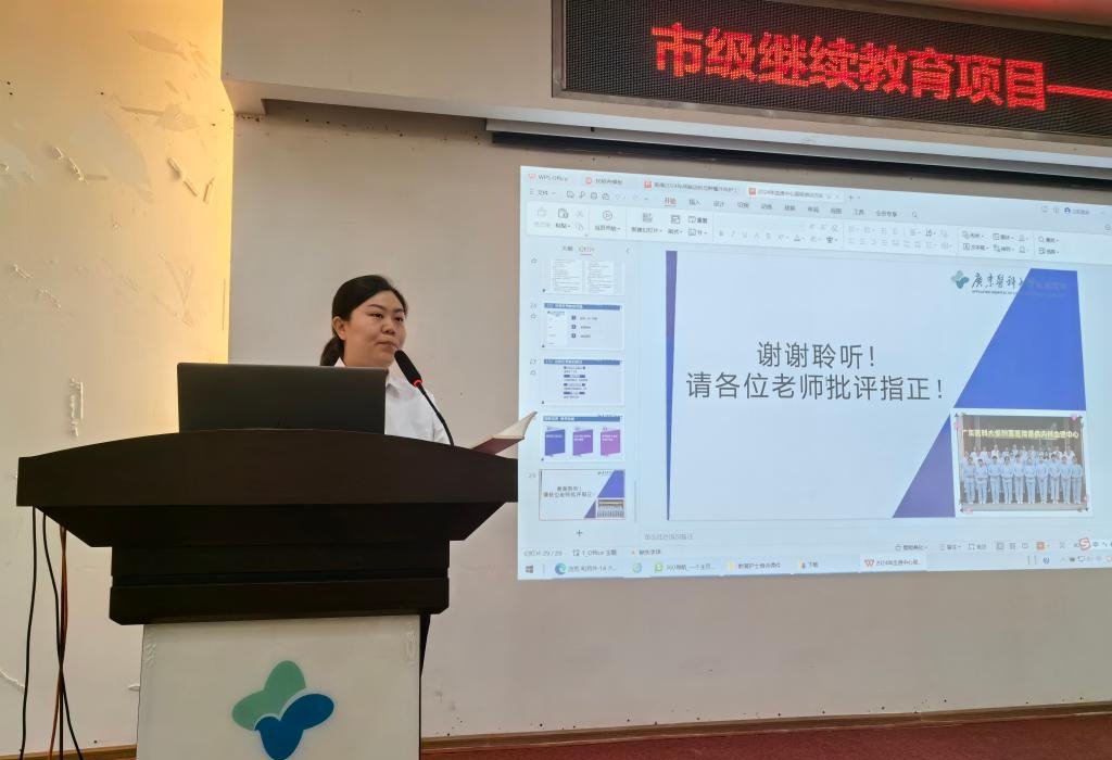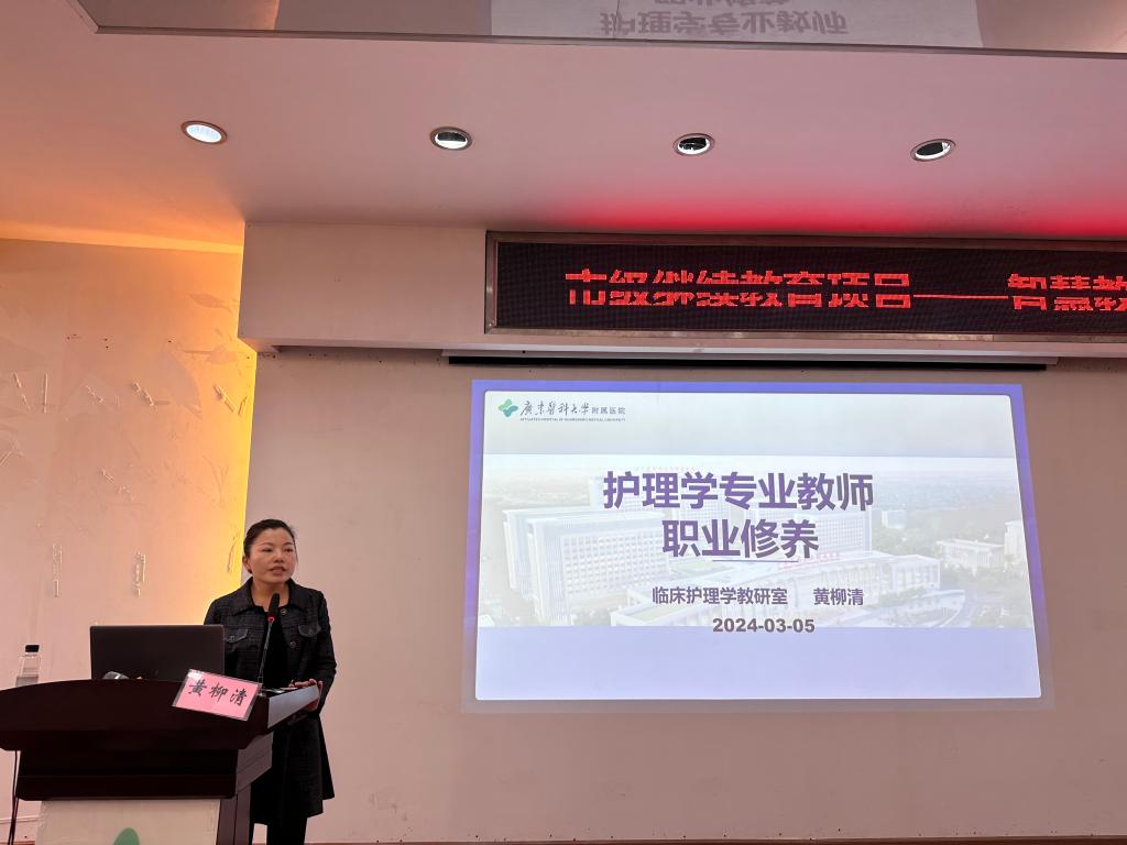 临床护理学教研室教学秘书黄柳清则以其幽默诙谐、激情饱满的情绪进行“护理学专业教师职业修养”维度解读,通过教育者自身“传道受业”的职业精神、高尚仁爱的职业道德来引导护理教育活动,从而保证临床护理教学质量。