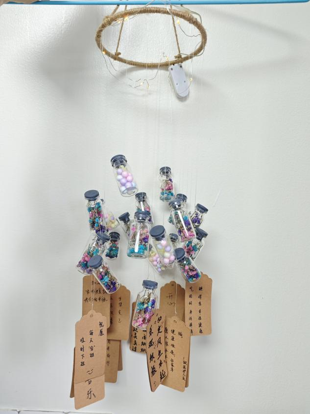 风铃寓意远方的祝福,我们希望通过这个作品,以“好韵”承“好运”,祝福我们工作顺利,祝福患者早日康复。生活中充满希望与温暖,砥砺前行。愿望风铃是人们传达祝福和对美好生活向往的重要载体。当病房召开病友会时,一件件充满祝福和寓意的手工作品摆在眼前,让病人在惊叹之余还有深深的感动,温情护理,最抚人心!