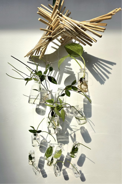 “悬挂于檐下的风铃,随和煦的春光奏响天明。人影一半,春光一半,虽没有华丽的外表,但有着最纯粹的声音,清澈而悠远。风铃随风轻响,籍着绿意,让你我在阳光下往返于春天。”用废弃的抗生素玻璃瓶做成风铃,瓶中种上植物悬挂于病房,让“废料”在新的场景中获得崭新的生命!既让大家得到了美的感受,还减少了科室购买病房装饰品的支出,体现了成本节约意识,共同推进医院节能减排工作!