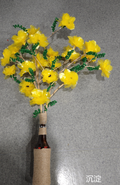 材料:黄色医疗塑料袋、竹枝、麻绳、扭扭棒、啤酒瓶