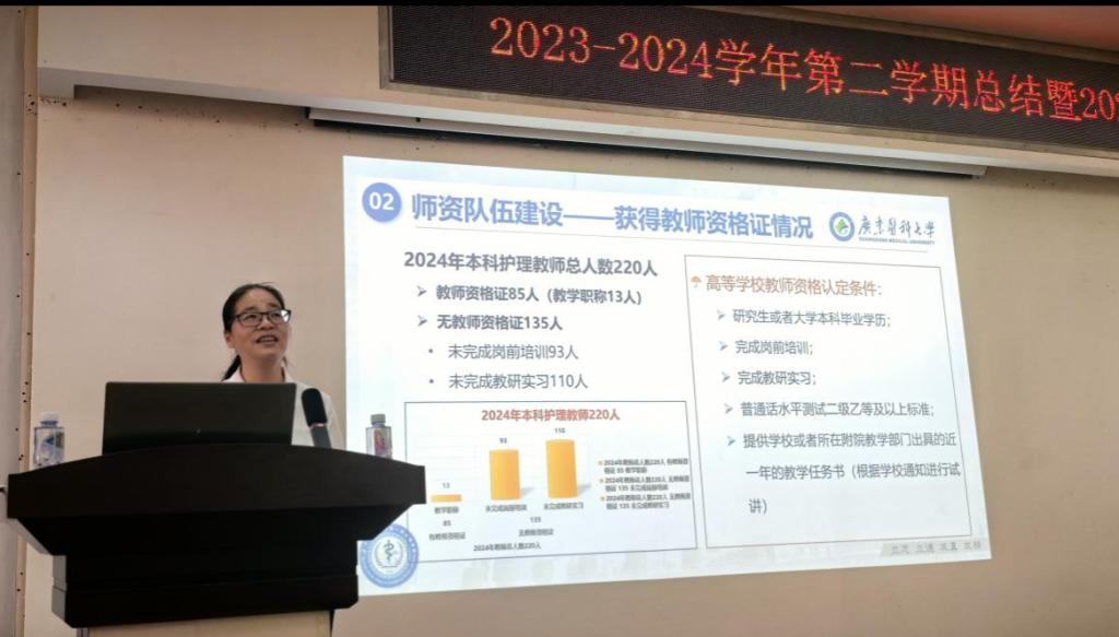在回顾与总结中,临床护理学教研室卜淑娟副主任明确阐述了工作思路,并对2023-2024学年第二学期的工作进行了详细汇报,内容涵盖了工作总体情况、师资团队建设、毕业工作、教学质控及临床带教工作五个方面。同时对护理教学团队上一学期的工作与贡献给予了肯定,并指出了在教学管理与实施过程中存在的不足。同时,强调了新学期的总体工作任务与要求,着重强调了抓教学任务、提升教学质量以及教师队伍的建设与培养。她还强调了立足于培养应用型人才的重要性,推动教学模式及教学改革的良性互动与融合。