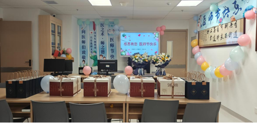 曙光初现,当第一缕阳光轻轻洒落,我们的护士团队已经忙碌起来,为医师节准备了一场小小的惊喜。科室的小课室内,前一晚精心布置的横幅和气球在晨光中显得格外生动,课桌上的鲜花和礼物,以及那香气四溢的蛋糕,都在静静地等待着医师们的到来。