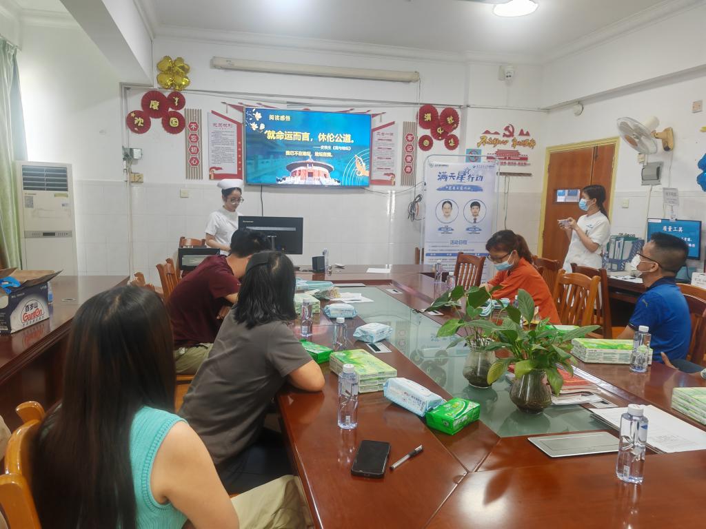 主持人李思远护士首先带领大家跟着文字走进史铁生苦难又灿烂的一生,曾经的他,是清华学霸,是擅长80米跨栏的运动健儿,1972年却因病致瘫,被困在小小的轮椅上。然而,身体的障碍与精神的绝望没有击垮他,他依旧不改初心,心态平和,并创作出许多经典作品。读完他坎坷的一生,大家神情各异,震惊于他的命途多舛,钦佩于他扼住命运的咽喉,感动于他亲友们的温情……