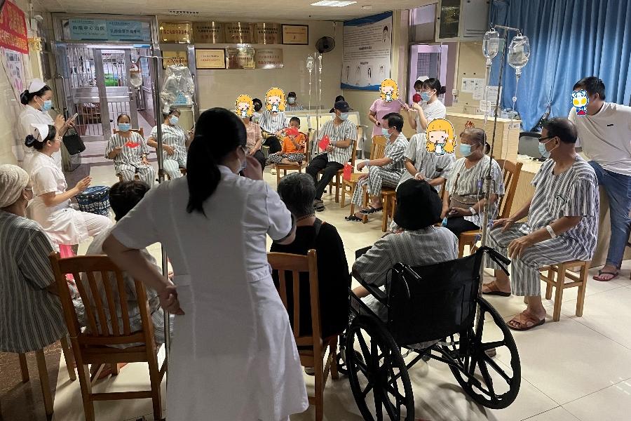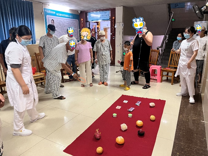 音乐会到了尾声,以一场轻松愉快的投圈游戏画上了圆满的句号。病友们和家属们积极参与,欢声笑语不断。就连其他科室的病友也被这份欢乐所吸引,纷纷前来参观并加入游戏行列。现场气氛热烈而温馨,每一个参与者的脸上都洋溢着幸福的笑容。