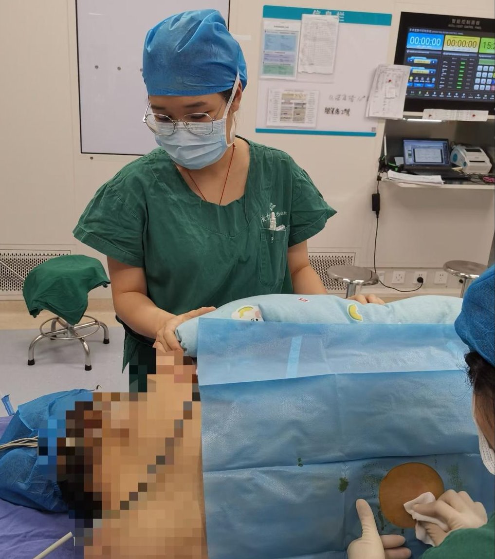 终于有一天,老师临时不在,由女孩来完成术前准备工作,回忆着老师的一言一行,她成功地将患者接入手术间。这名患者是一位73岁的奶奶,需要进行腰麻,安置好体位后,一个画面忽然在女孩瞳孔中放大:老奶奶努力弓着背,银色的发丝在灯光的照射下尤为明显,因紧张微微颤抖的布满沟壑的双手紧紧抓着裤腿,皱纹条条但依旧明亮的双眼焦急地往来望去……她不自觉地想起了自己一年前也做过手术的外婆,一样的处境,不一样的时间,不经令女孩鼻头一酸,她想着:门外是否也有一个如她一般年纪的女孩在焦急等待?奶奶是否也在害怕地寻找孙女的身影?由于其他老师语言不通,借助语言优势,女孩握着患者的双手,轻轻拍打着奶奶的肩膀,与她沟通、聊天,分散患者注意力,帮助麻醉医生顺利完成麻醉。